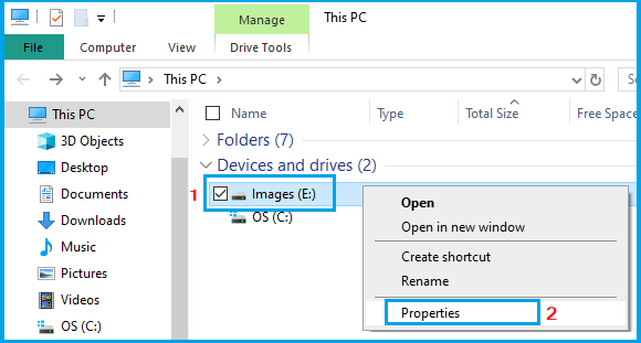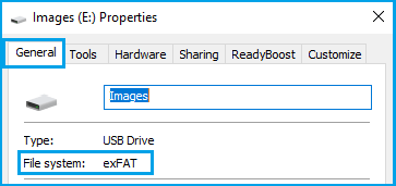 3. On Properties screen, you can see the File Format of the external disk next to File System Entry.